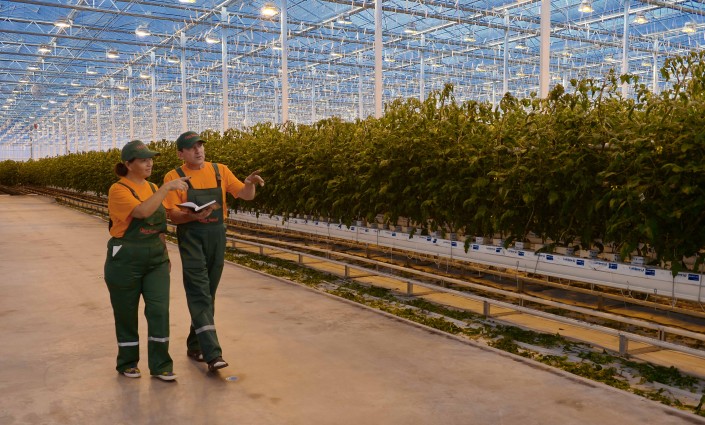 Действующий тепличный комплекс состоит из двух модулей по 5 гектаров каждый. В первом, введенном в эксплуатацию в 2016 году, выращиваются розы, во втором - томаты, эта теплица появилась в 2017 году. Семена для посадки томатов предприятие закупает у голландской фирмы RijkZvaan, специалист этой же компании контролирует все этапы выращивания этого овоща.