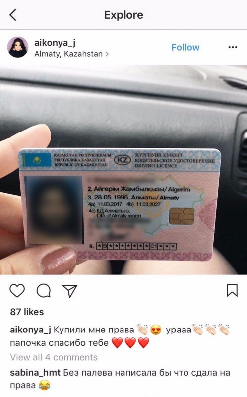 В марте 2017 года знаменитостью стала жительница Алматинской области Айгерим Фазылова, которая в Сети поблагодарила отца за "купленные" водительские права.