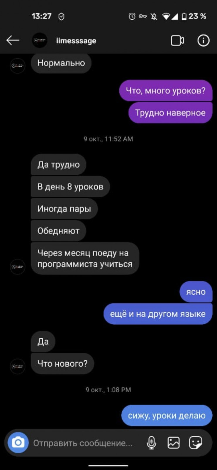 Обычная переписка школьников об уроках и обсуждение того, кто чем занят сейчас. Иманали писал, что учиться в Польше трудно, в день 8 уроков, и что через месяц поедет учиться на программиста.