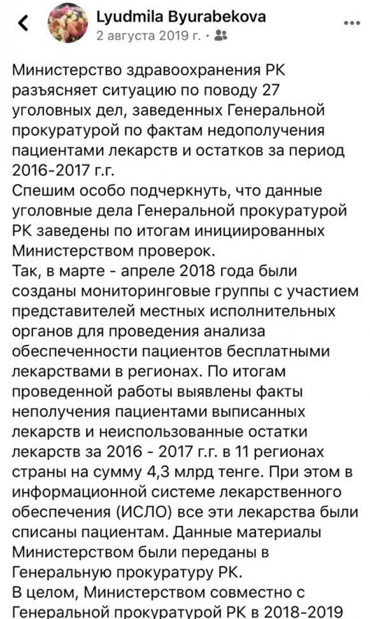 "Мы, наоборот, по итогам проверки Генеральной прокуратуры привели в порядок ценообразование на лекарства. И сейчас Генпрокуратура вновь проводит проверку по данным ими рекомендациям. По пунктам все исправлено. Проверяли за 2016, 2017 годы, и немного захватили 2018 год, но на 2018 год цены перешли с 2017 года", - сказала Бюрабекова.