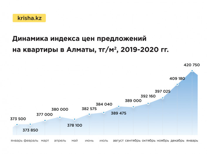 В число городов с наибольшей динамикой цен вошел и Алматы. Индекс прибавил 2,8 процента и достиг очередного максимума - 420 750 тенге за квадратный метр. Темп роста в последние месяцы ускорился.