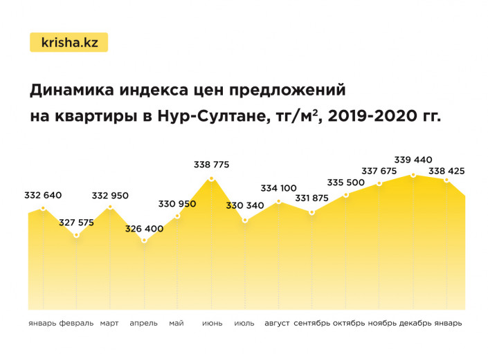 Снижение индекса отмечается только в двух городах: Нур-Султане и Таразе. В столице квадратный метр выставлялся на продажу по 338 425 тенге за квадратный метр, что на 0,3 процента дешевле, чем в декабре. В отличие от большинства других городов, динамика там нестабильна и постоянно меняет направление. В январе, в частности, снижение пришло на смену укреплению цен. Линия тренда при этом остается восходящей.