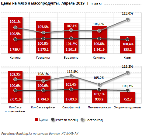 Так, за апрель 2019 года заметно увеличились цены на баранину - на 1,2 процента, до 1501,8 тенге за килограмм (за год рост составил 7,1 процента). Говядина и свинина подорожали на 0,8 процента за месяц, до 1575,1 тенге и 1341,9 тенге за килограмм, соответственно. За год говядина подорожала на 5,3 процента, свинина - на 6,6 процента.