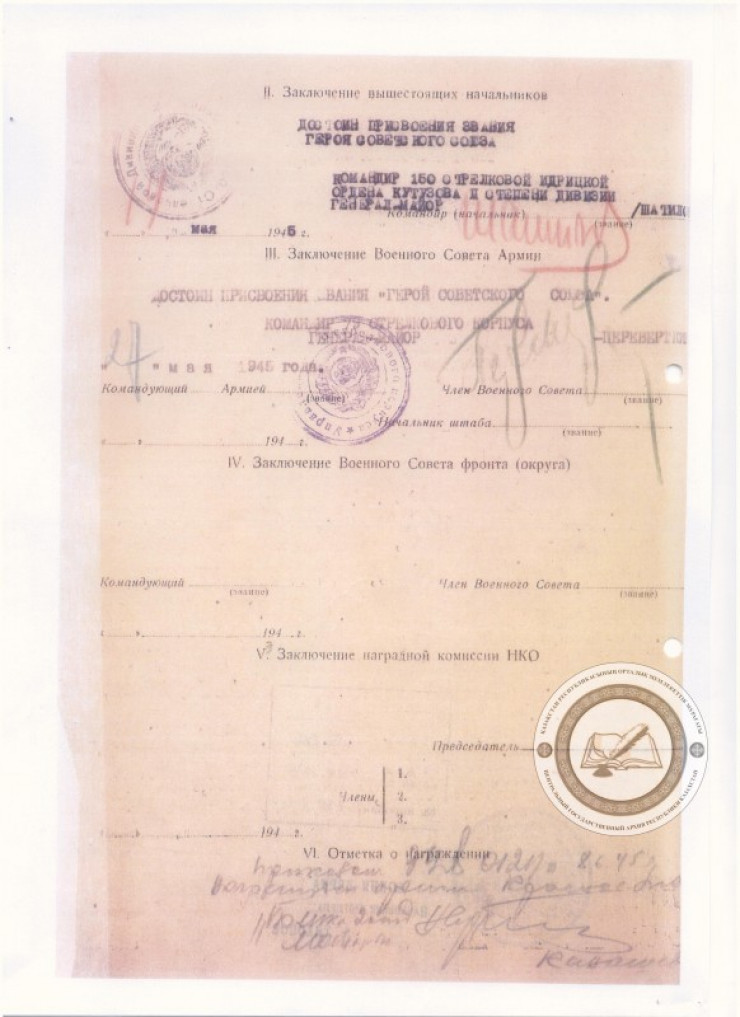 Приказ водрузить красное знамя на Рейхстаге был получен от командира знаменитого 674-го полка подполковника Плехаданова сразу после взятия Берлина. Командир батальона Давыдов и политрук Васильченко доверили выполнение задания командира полка Рахымжану.