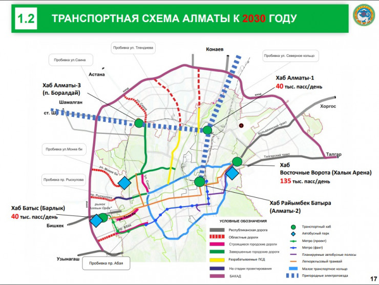 - построить четыре транспортно-пересадочных хаба с перехватывающими парковками и подвозящими маршрутами из агломерации и менее плотных районов города. Это хаб "Батыс" (рынок Барлык) на 40 тысяч пассажиров в день, хаб "Райымбек батыра" вокруг вокзала Алматы-2, хаб "Алматы-3" (в поселке Боралдай со станцией метро "Боралдай"), хаб "Восточные ворота" у Кульджинского тракта (135 тысяч пассажиров);