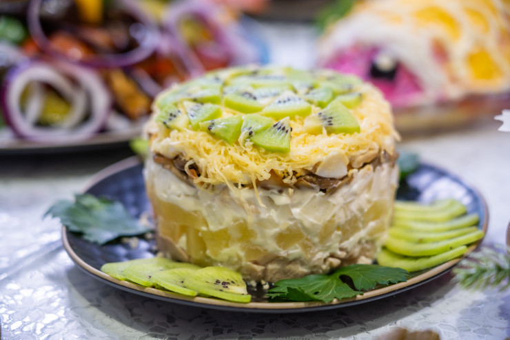 - У нас много таких рецептов. Например, салат "Изумрудный". Для него понадобится отварное филе курочки, слегка поджаренные шампиньоны, консервированные ананасы, сыр, вареные яйца, майонез и киви. Всё укладывается слоями: курица, грибы, мелко нарезанные ананасы, сыр и яйца. Соль и перец – по вкусу. Каждый слой нужно слегка промазать тонким слоем майонеза, а верхний слой - украсить тонкими ломтиками киви. Салат получается необычный, очень нарядный и вкусный.