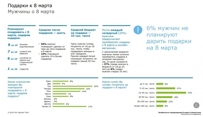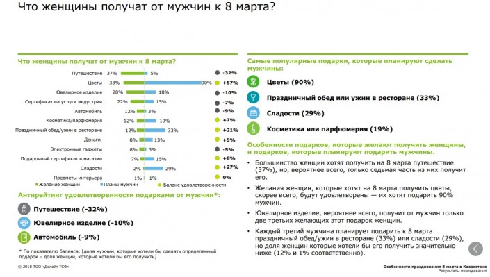 В исследовании отмечается, что девять из десяти казахстанцев планируют поздравить близких родственников с 8 Марта и подарить им подарки. 33 процента казахстанцев планируют устроить праздничный обед или ужин в ресторане.