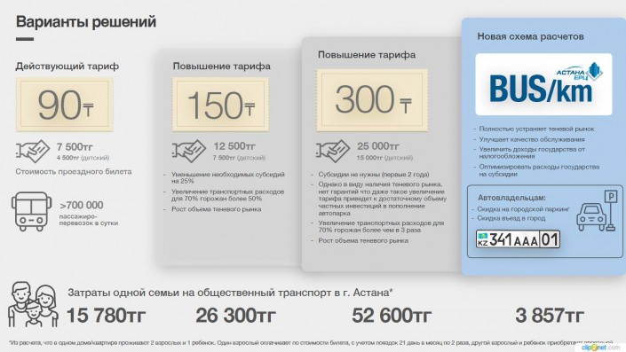 Напомним, в сентябре 2017 года аким Астаны Асет Исекешев представил предложения по развитию городского общественного транспорта. В одном из предложений предлагалось повысить цену на проезд до 300 тенге, в другом рассматривалась возможность условно бесплатного проезда для всех при едином сборе за развитие системы транспорта.