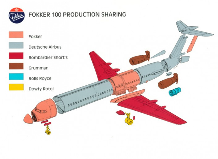 По данным Airwar.ru, основой для этого самолета послужил более ранний планер Fokker F28. Разработчики удлинили фюзеляж на 5,51 метра, что позволило увеличить количество пассажиров до 107 человек вместо 85. Была изменена механизация крыла для повышения подъемной силы на взлете и посадке, увеличился размах крыльев. У "сотки" он составляет 28,08 метра.