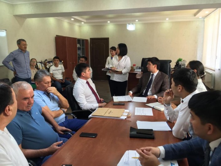 Одно из последних рабочих собраний Даната Жумина (в центре, в коричневом костюме) на посту замакима Шымкента. Фото: facebook.com/danat.zhumin