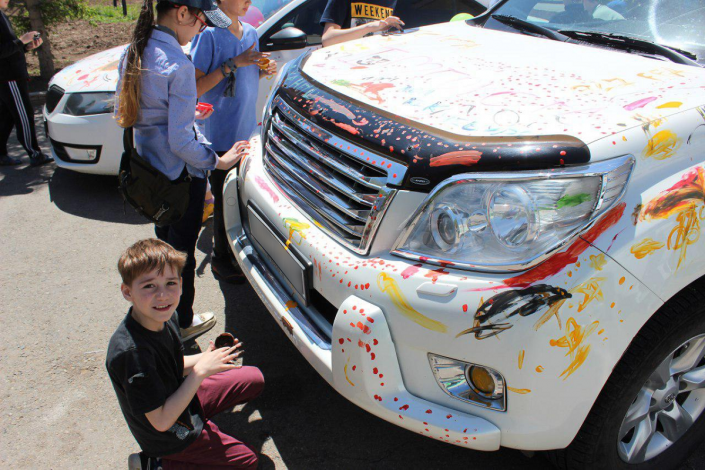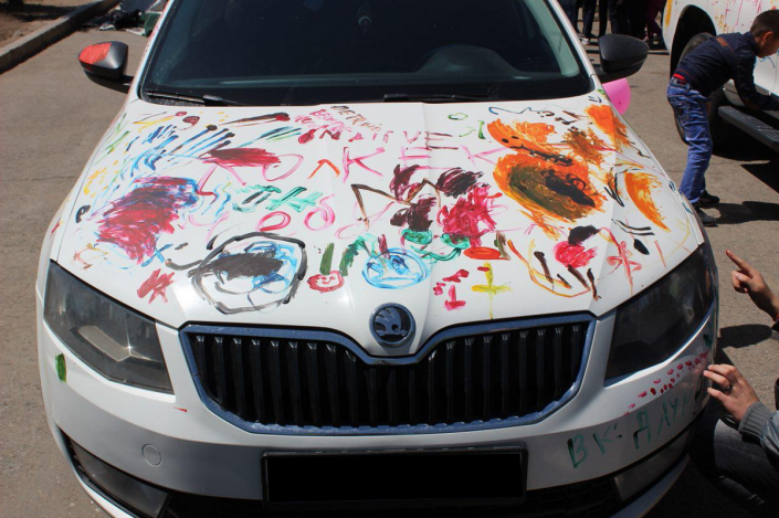 Им дали возможность выступить в роли дизайнеров. На авто появились смешные рожицы, разноцветные круги, линии и точки. А на капоте одной из машин красовалась надпись "Майнкрафт".