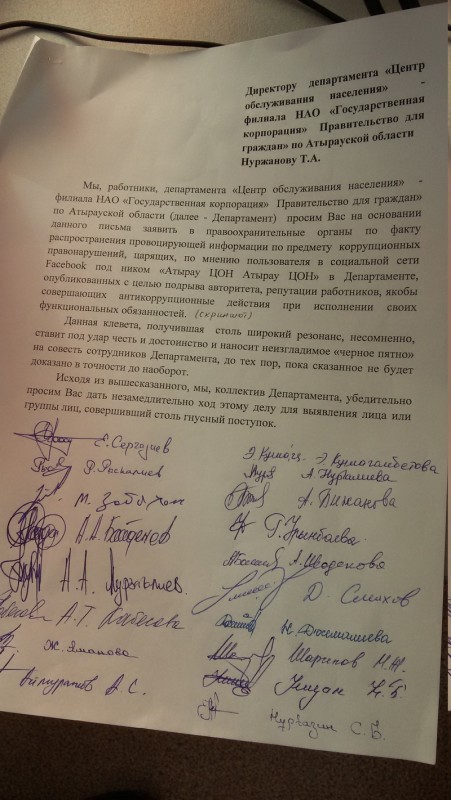 "Мы, работники ЦОН Атырауской области обращаемся к Вам с просьбой восстановить справедливость и дать возможность спокойно работать ЦОНу Атырауской области. У директора ЦОНа Нуржанова Турлана Амангельдиевича открыта частная лавка, которая обеспечивает его безбедную жизнь. Он через своих подставных лиц, состоящих из его близких и дальних родственников, которые находятся в каждом направлении государственной услуги (накопительный, паспортный, кадровый отделы, бухгалтерия), получает взятки за оказание услуг", - говорится в письме, которое распространяют в соцсетях и через WhatsApp.