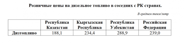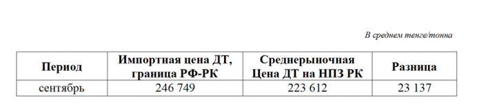 При этом оптовая цена импортного дизеля на границе Российской Федерации и Республики Казахстан (без учета доставки и хранения) составляет 246 749 тенге за тонну (202 тенге за литр), что дороже внутренних оптовых цен на 23 137 тенге (данные Аргус. Рынок Каспия.)