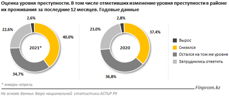 В плане оценки уровня преступности за последние 12 месяцев 40 процентов опрошенных отметили, что он снизился, 34,7 процента, что он остался на том же уровне, 22,6 процента затруднились ответить, 2,6 процента считают, что уровень преступности вырос.