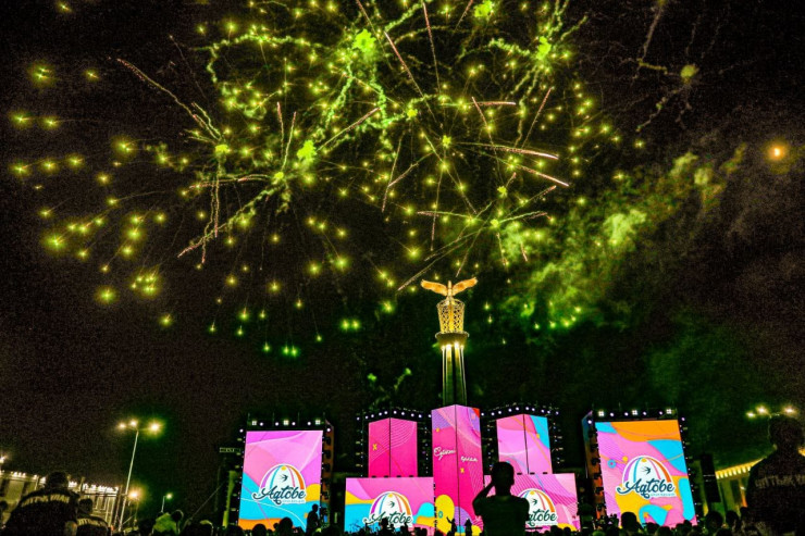 Собравшиеся на площади жители и гости города Актобе увидели не только выступления знаменитых певцов, но и красочный фейерверк, озаривший ночное небо города на белом холме тысячей ярких огней.