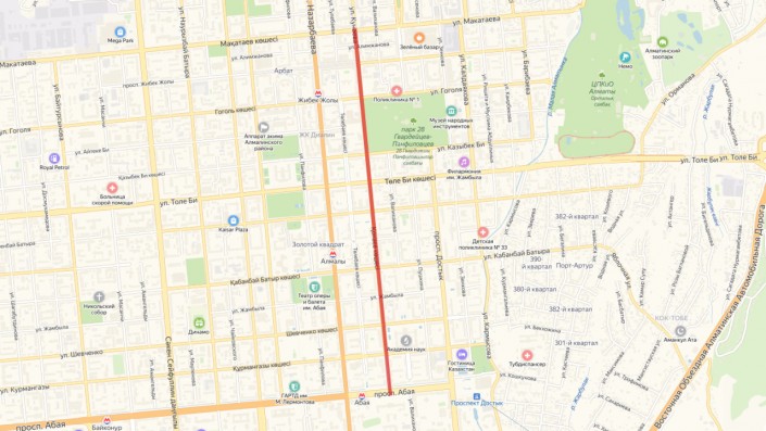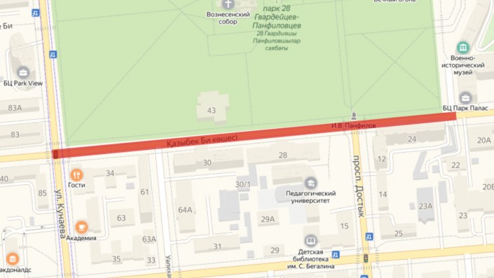 По улице Казыбек би от улицы Кунаева до улицы Зенкова.
