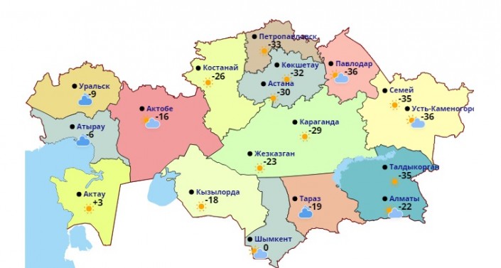 Самая низкая температура 24 января зафиксирована в Усть-Каменогорске и Павлодаре - 36 градусов мороза. В Семее и Талдыкоргане - 35 градусов со знаком минус, Петропавловск - 33 градуса мороза, Кокшетау - 32 градуса мороза. В Астане - 30 градусов мороза, в Алматы - 22 градуса мороза. По прогнозам синоптиков, в трех областях Казахстана ожидается сильный ветер.