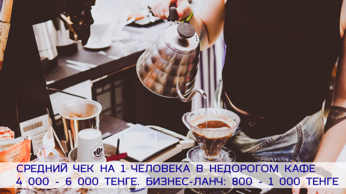 Средний чек в недорогом кафе на одного человека 4 000 - 6 000 тысяч тенге. Бизнес-ланч - от 800 до 1 000.