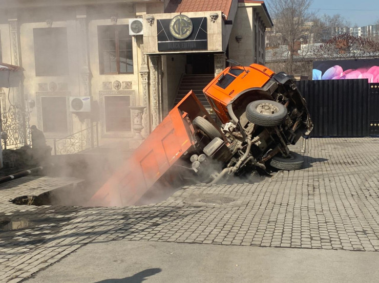 Грузовик провалился под землю в Алматы. Видео с места происшествия разослали очевидцы, а медики сообщили, что сотрудник частного предприятия получил травмы, передает корреспондент Tengrinews.kz.