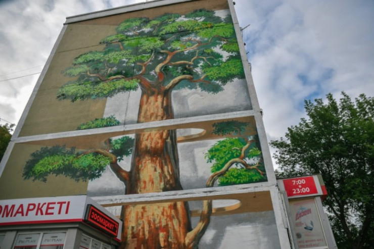 Асхат Ахмедьяров является автором нескольких муралов на зданиях столицы. Одна из работ - "Жить с деревом" на доме по улице Бейбитшилик, 29.