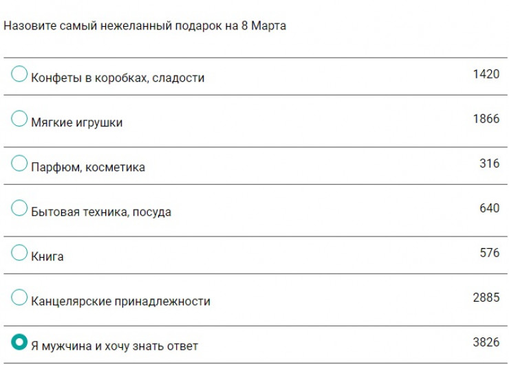 Еще 8,3 процента женщин не хотели бы получить в подарок бытовую технику и посуду, а 7,5 процента проголосовали против книг к 8 Марта.
