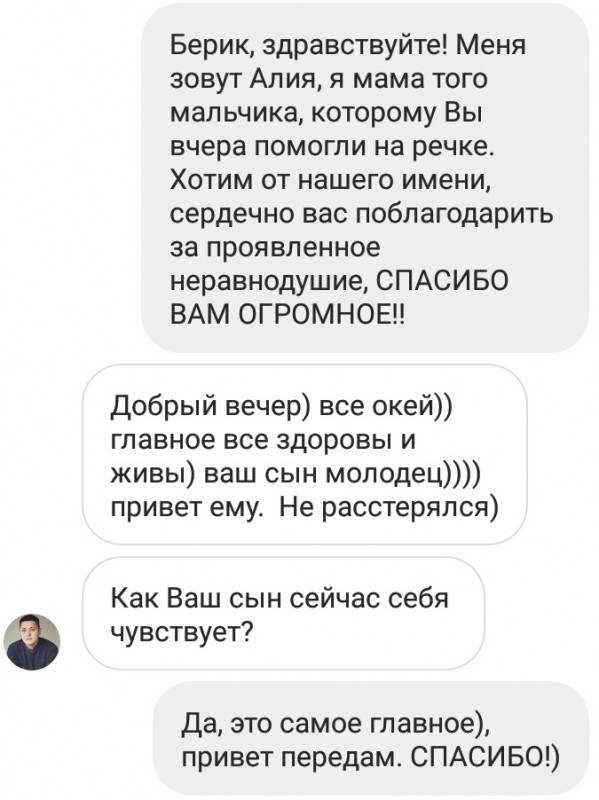 "Я надеялась и чувствовала, что где-то в соцсетях или в СМИ об этом могут написать. И что нашего героя найдут. В понедельник вечером друг семьи скинул нам публикацию на сайте Tengrinews.kz, где мы узнали, что его зовут Берик. Далее через редакционный WhatsApp-номер мы попросили скинуть контакты парня. Однако, не дожидаясь ответа, я увидела в публикации ссылку на его личную страницу в соцсетях. Я написала ему в direct в Instagram и поблагодарила за такой поступок", - сказала мать Алижана.