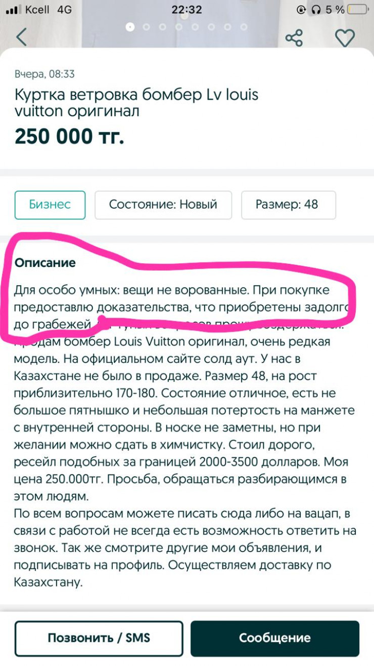 При этом Усенбаев советует сохранить объявление продавца, его номер телефона и переписку с продавцом, если она имеется. Все это может пригодиться в том случае, если выяснится, что приобретенный товар был добыт продавцом преступным путем.