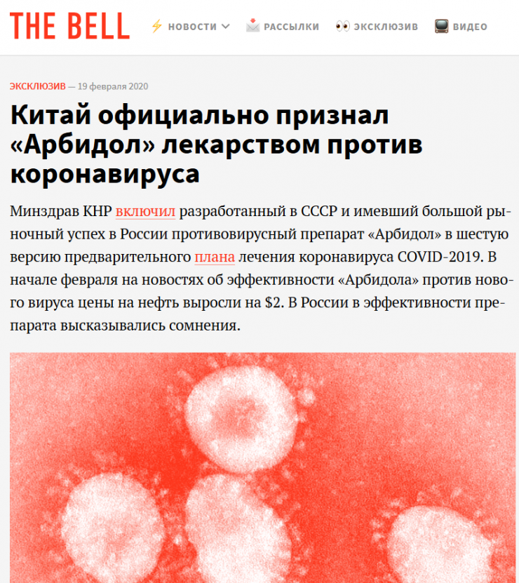 Ресейде коронавирустан емдейтін дәрі анықталды деген ақпарат тараған. Мұндай тақырыппен The Bell, "Дождь" және "Ведомости" секілді басылымдар ақпар берген. Олар ресейлік "Арбидол" дәрісі коронавирустан емдейді деп хабарлаған. Кейін бұл ақпаратты басқа да БАҚ өкілдері іліп әкеткен.