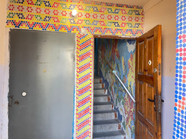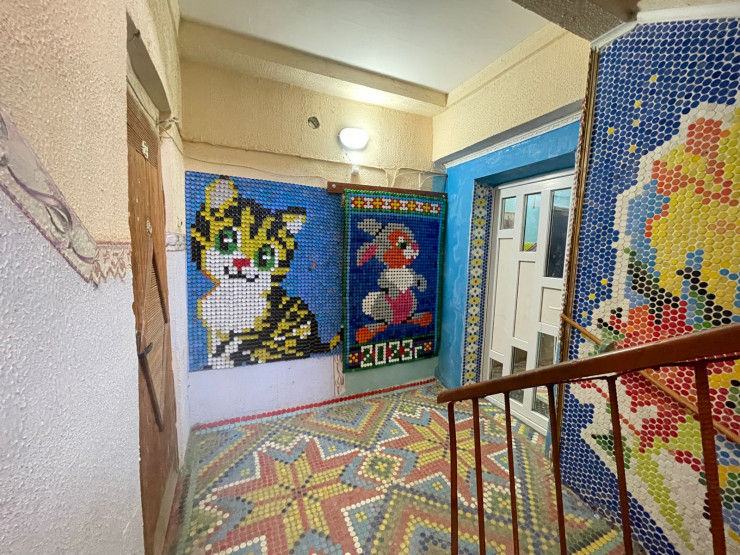 Житель Балхаша украсил подъезд своего дома мозаикой из пластиковых крышек. На оформление двух этажей у него ушло около 60 тысяч крышек.