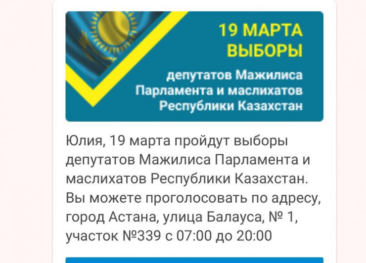 Как сообщила нам жительница Астаны, сегодня утром она отправилась голосовать по адресу, который был указан в ее мобильном приложении eGov – улица Балауса, 1.