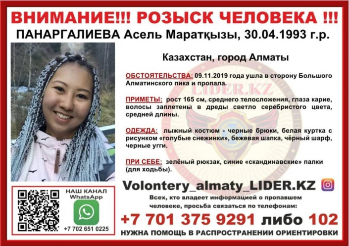 Асель Панаргалиева ушла в горы в одиночку и пропала 9 ноября. Полицейские начали розыскное дело. 12 ноября спасатели прекратили поиски пропавшей туристки. Однако в тот же день родственники обратились с просьбой продолжить поисково-спасательную операцию. Ее возобновили утром 13 ноября, однако поиски не дали результатов.