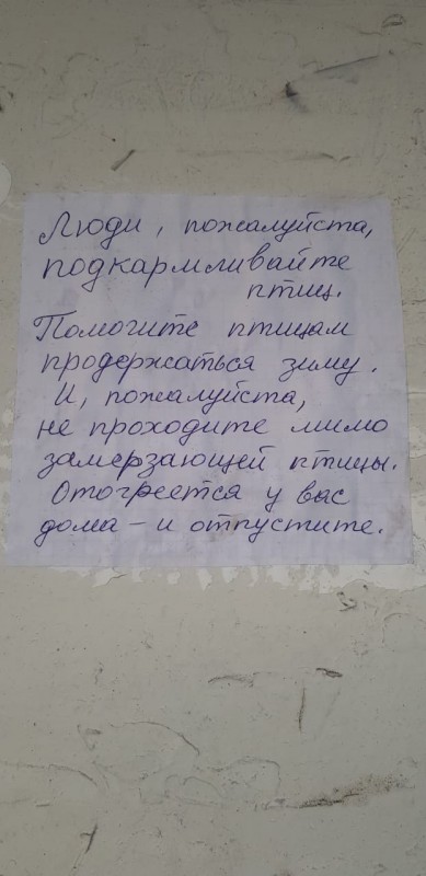 В других объявлениях, расклеенных на остановках, неравнодушные просят людей не проходить мимо замерзающих птиц и по возможности подкармливать их. Такие записки появляются в Караганде каждую зиму на протяжении нескольких лет.