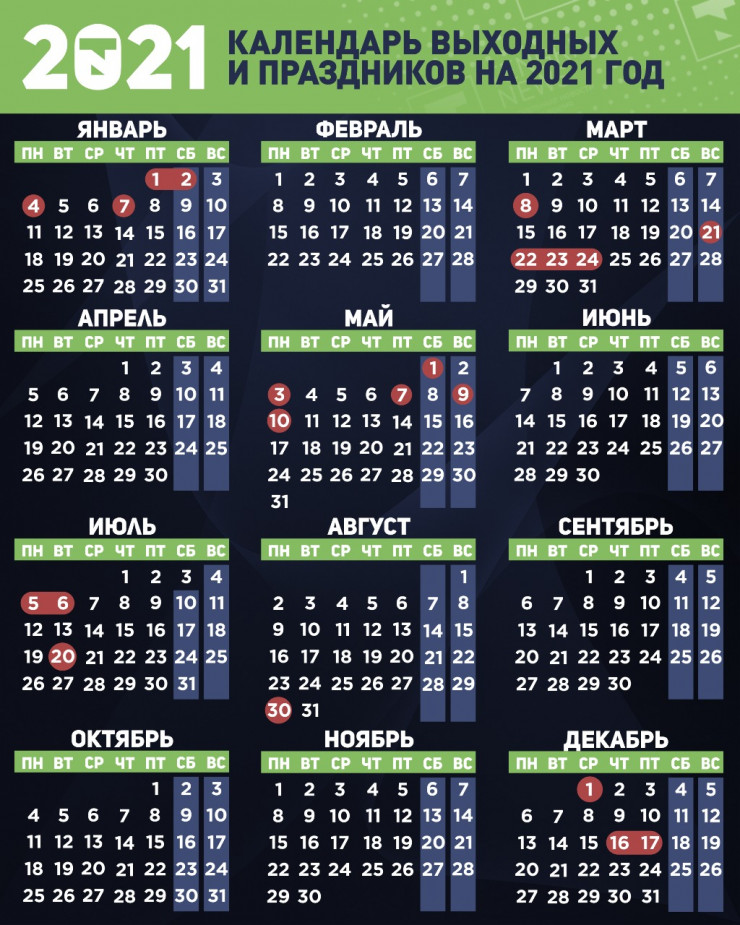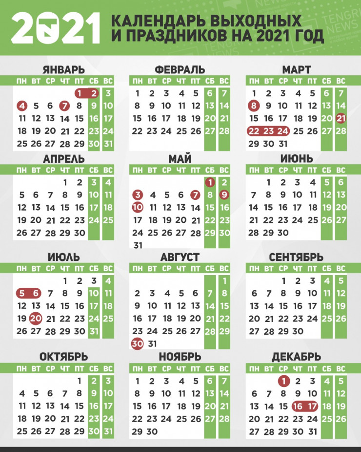В 2021 году казахстанцев ждут 245 рабочих дня и 120 выходных дней. Больше всего выходных выпадет в январе и мае. Редакция Tengrinews.kz собрала все праздничные и выходные дни, а также дни переноса выходных из-за праздников в удобный календарь праздников для казахстанцев на 2021 год.
