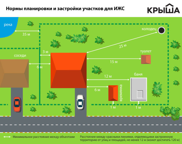 Среди требований и рекомендаций при строительстве не стоит забывать об отступах. От границ участка и красных линий обязательно нужно отступать не менее трех метров. От смежных границ с соседними участками также необходимо отступить не менее трех метров, чтобы расстояние между постройками на вашем и соседнем участке составляло не менее шести метров.