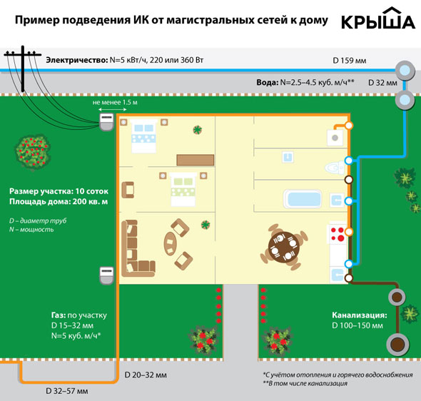 В опросном листе для техусловий нужно заполнить таблицу с планируемыми мощностями коммуникаций для дома - электроснабжение, водоснабжение, канализация, теплоснабжение, ливневая канализация, телефонизация, газоснабжение. К примеру, для обслуживания двухэтажного дома площадью 120 квадратных метров достаточно пяти киловатт электроэнергии и 0,76 кубометра воды в час. Далее архитекторы отправляют опросный лист поставщикам, которые определят точки врезки и возможность предоставления указанных мощностей", - подчеркнули специалисты.