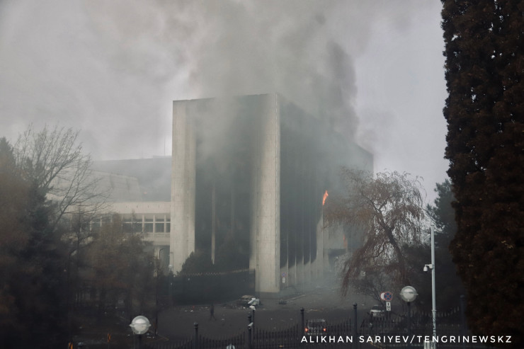 По словам корреспондента, здание городского акимата Алматы 6 января продолжало дымиться и гореть.