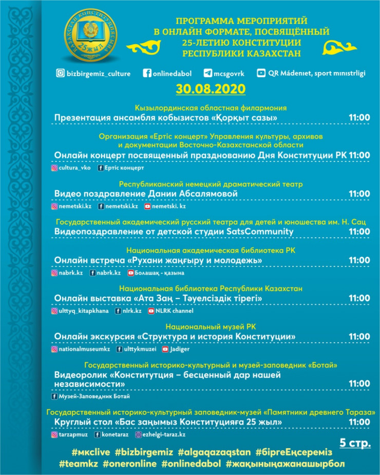 Музеи и библиотеки нашей страны также запланировали ряд мероприятий. Центральный Государственный музей Республики Казахстан и Национальный музей проведут онлайн-экскурсии ко Дню Конституции.