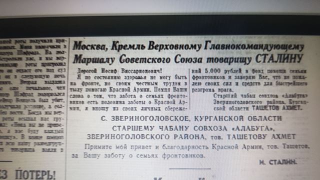 "Мой дед Ахмет Ташетов родился в Зауралье в 1927 году. Когда началась Великая Отечественная война, он, как и все солдаты, любящие свою Родину, хотел отправиться на фронт. Но его откомиссовали по состоянию здоровья.