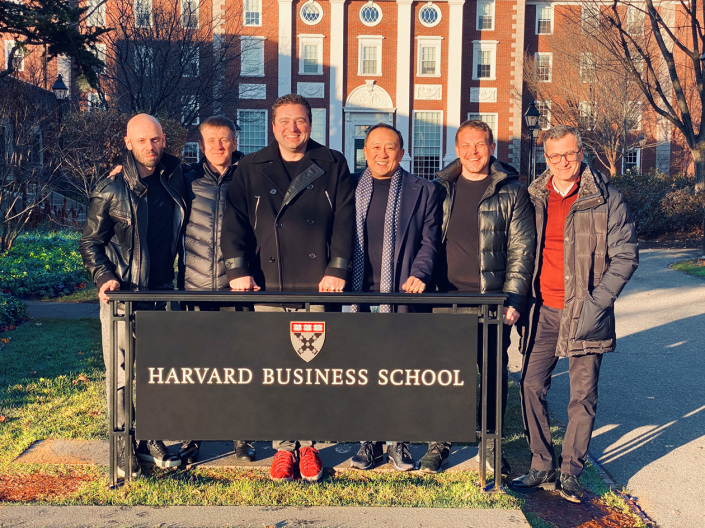 На экран вывели фотографию, где в окружении студентов Гарварда стоят Михаил Ломтадзе и команда Kaspi.kz.