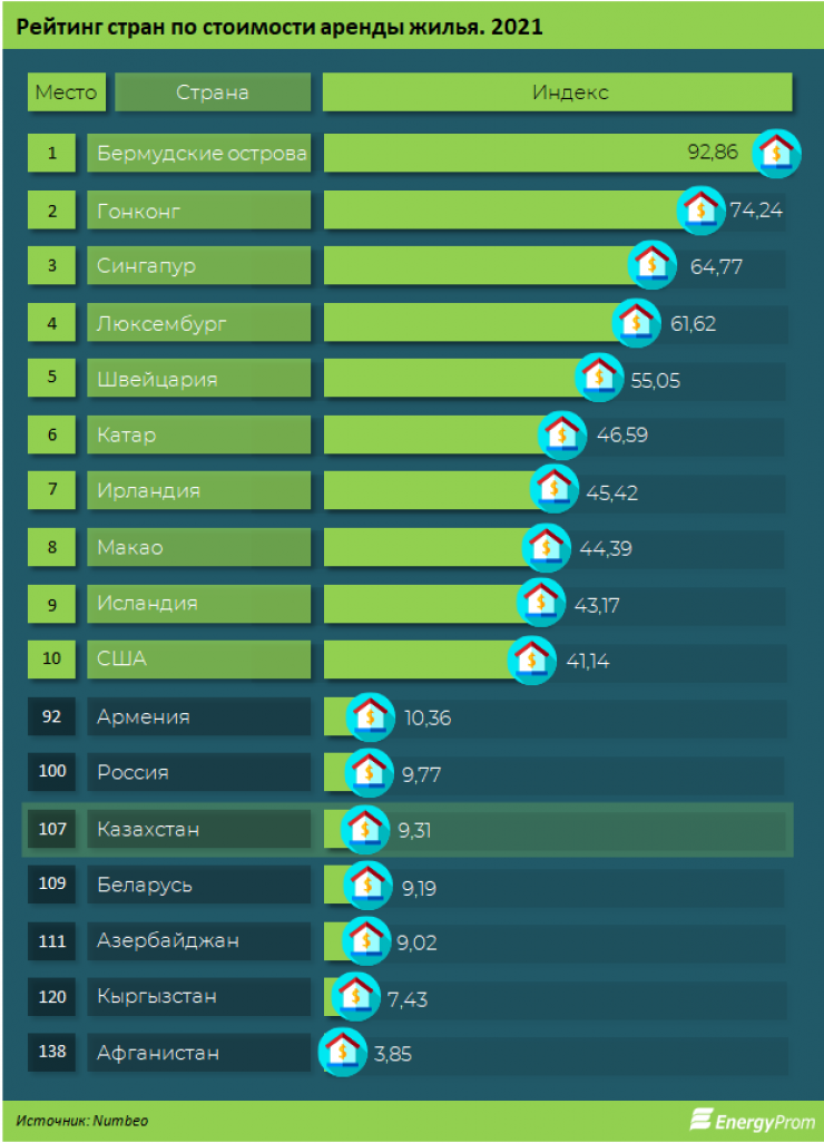 В рейтинге стран мира по стоимости аренды жилья Казахстан на начало 2021 года занял 107-е место из 138. Рейтинг оценивает, насколько дороже или дешевле обходится аренда в странах относительно Нью-Йорка, индекс которого составляет 100. Если индекс страны составляет 110, значит, аренда там обходится на 10 процентов дороже, чем в Нью-Йорке. Если меньше, например, 95 процентов, - то на пять процентов дешевле относительно этого американского мегаполиса, поясняют аналитики.
