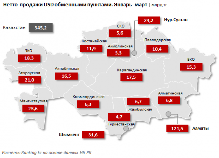 Среди регионов Казахстана по объему нетто-продаж американской валюты традиционно лидируют мегаполисы. На первом месте Алматы: 121,5 миллиарда тенге, рост за год составил 1,3 процента.