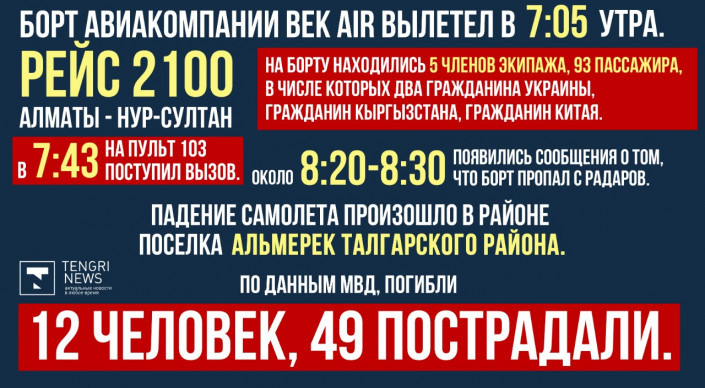 "За два дня из Нур-Султана в Алматы были перевезены 33 члена семей пострадавших при крушении самолета Bek Air. Коммерческих пассажиров просили уступить место родственникам пострадавших. Большая благодарность пассажирам, которые изъявили желание, проявили сострадание, уступили свое место и таким образом отправляли родных. Понимаем, что у всех есть свои планы, семьи, на Новый год, но кто-то по-человечески пошел (на уступки. - Прим. автора). Сегодня отправили мать 11 детей, у нее один ребенок пострадал в авиакатастрофе, она попросила со всеми десятью детьми вылететь. Их приняли полностью", - рассказал директор по управлению доходами авиакомпании Air Astana Ерболат Байсылыков.