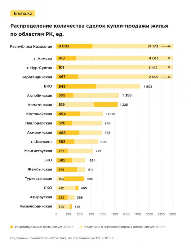 В целом с января по август 2019 года в РК зарегистрировано 205 939 сделок купли-продажи жилья.
