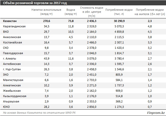 Если подсчитать потребление водки на среднестатистического казахстанца старше 15 лет в региональном разрезе, то разница между областями будет просто колоссальной. Согласно официальным данным, самые "пьющие" казахстанцы к началу 2018 года проживали в Карагандинской области. Здесь на взрослого человека потреблялось в 7 раз больше водки, чем в "малопьющей" ЮКО (сейчас Туркестанская область и город Шымкент). А вот статистика заболеваемости от алкоголя говорит обратное: именно в Карагандинской области они самые низкие. Это подтверждает, что здесь рынок алкоголя более прозрачен.