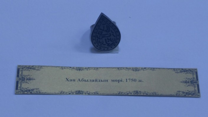 На фото образец кольца Абылай хана. Прикладные металлические печати изготавливались в основном в виде крупных серебряных перстней каплевидной формы. Согласно письменным источникам, каплевидную форму перстней носили представители правящей элиты. На наружной поверхности перстней арабской вязью нарезались полные имена их владельцев и сведения о принадлежности к династии. Такую печать можно было увидеть и на постановлениях, которые выносил суд биев.
