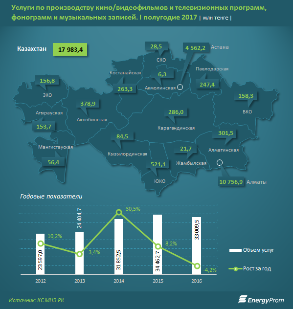Объем услуг по производству кинофильмов, телепрограмм и музыкальных записей в Казахстане увеличился на 58,5 процента за год, сообщается в исследовании Energyprom.kz.