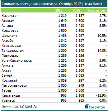 Билеты в кино по итогам октября стоили в среднем по РК 1 219 тенге за сеанс - на 2,7 процента больше, чем годом ранее. Больше всего в крупных городах и мегаполисах страны платить приходится киноманам Атырау и Астаны.