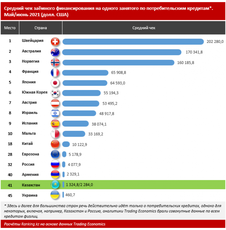 При этом по большинству стран в рейтинге Trading Economics учитывались исключительно потребительские кредиты, однако по некоторым, включая, к примеру, Казахстан и Россию, был приведен общий объем всех займов населения, в том числе ипотечных и прочих розничных. И даже в этом случае объемы кредитования на занятого жителя в Казахстане заметно ниже, чем в таких развитых странах с мощными кредитными рынками, как Швейцария (202,3 тысячи долларов), Австралия (170,3 тысячи долларов), Норвегия (160,2 тысячи долларов), Франция (65,9 тысячи долларов) и так далее. Казахстан также значительно отстает от Китая (10,1 тысячи долларов на одного занятого), уступает России (4,1 тысячи долларов) и Армении (2,3 тысячи долларов).
