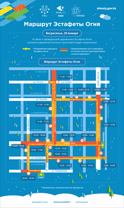 Далее факелоносцы отправятся в сторону проспекта Достык и оттуда донесут огонь Универсиады до Дворца Республики. Символ предстоящих игр также побывает на высокогорном катке "Медеу" и горнолыжном курорте "Шымбулак". Там факел будут нести призерка зимних Олимпийских игр Елена Хрусталева, альпинист Максут Жумаев и певец Али Окапов. А завершит эстафету боксер Назым Кызайбай.