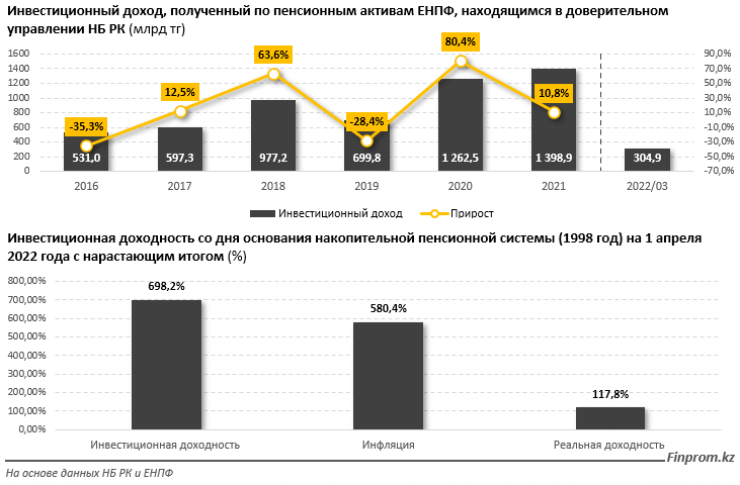 Несмотря на сложную геополитическую ситуацию с начала этого года и изменчивость на мировых рынках, инвестиционный доход по пенсионным по итогам первого квартала текущего года сложился в размере 304,9 миллиарда тенге. За прошедший 2021 год сумма начисленного инвестиционного дохода, распределенного на пенсионные счета вкладчиков, составила порядка 1,4 триллиона тенге, и это сразу на 10,8 процента больше показателя 2020 года. Доходность по пенсионным активам ЕНПФ за прошлый год составила 11,13 процента, при инфляции в 8,4 процента.